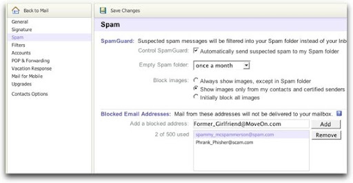 Click Options, then on the list on the left click Spam. Right in the middle of the page you’ll find a space in the “Blocked Email Addresses” section. All you’ve got to do is put any email addresses you don’t want to get mail from in here, then click Add.