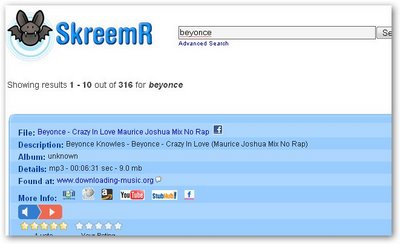 One neat SkreemR feature is the built-in music player that lets you preview a song before downloading it. It's also interesting that you can rate search results. This might come in handy for filtering out junk audio files.